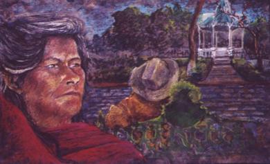 | "Contemplando Mexico" 2002 watercolor on canvas 2’ x 1’ |