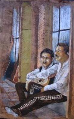 | "Los Mariachis" 2002 oil pastel on amate 15”x 23” |